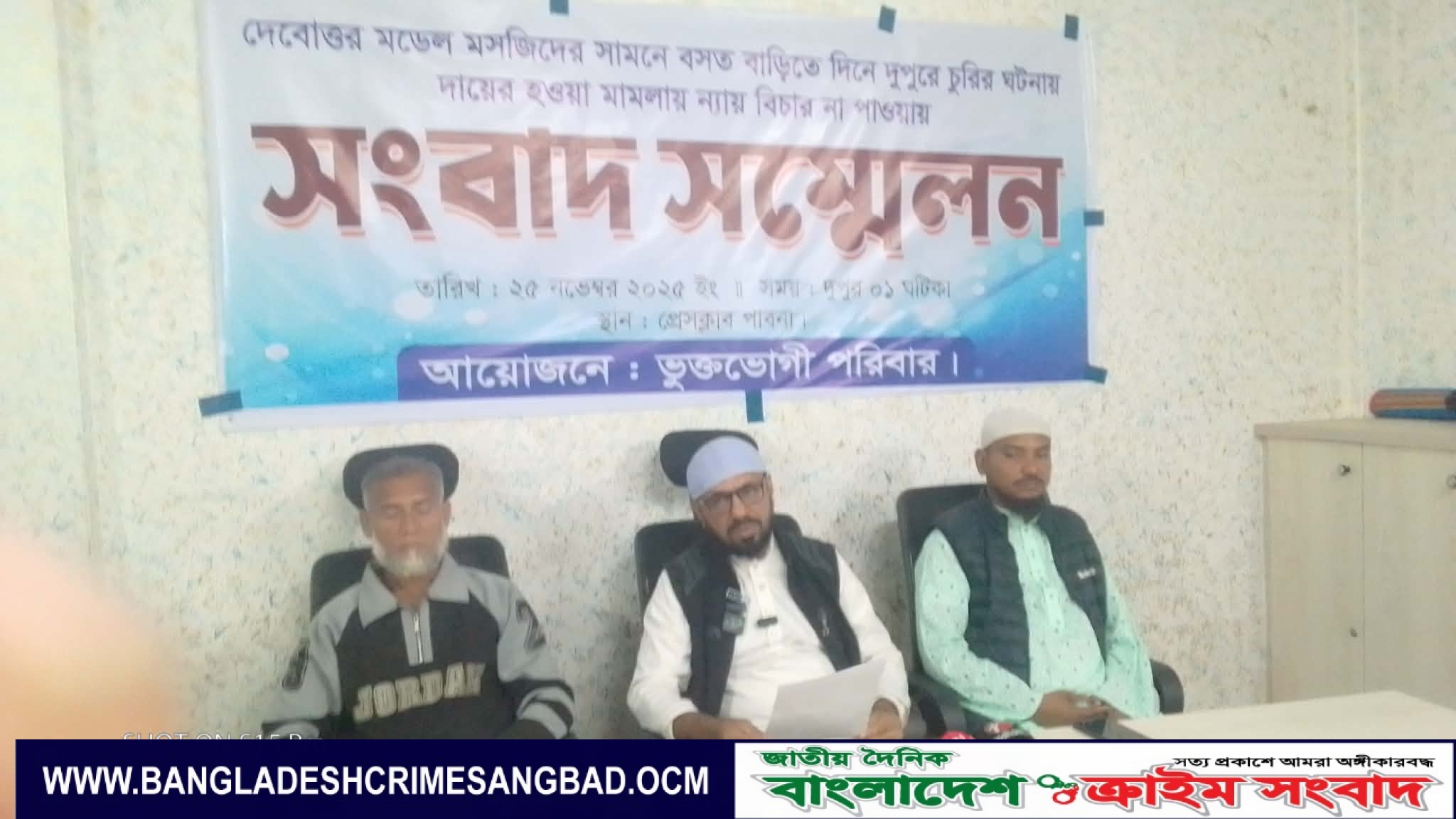 পাবনার আটঘরিয়ার দেবোত্তর মডেল মসজিদের সামনে বসত বাড়িতে দিনেদুপুরে চুরির ঘটনায় আটঘরিয়া থানা পুলিশ, ৭ মাসেও কাউকে গ্রেফতার করতে পারেনি বলে সংবাদ সম্মেলনে অভিযোগ করেন ভুক্তভোগী পরিবার। এবিষয়ে ভুক্তভোগী পরিবার প্রেসক্লাব পাবনায় সংবাদ সম্মেলন করেছেন।