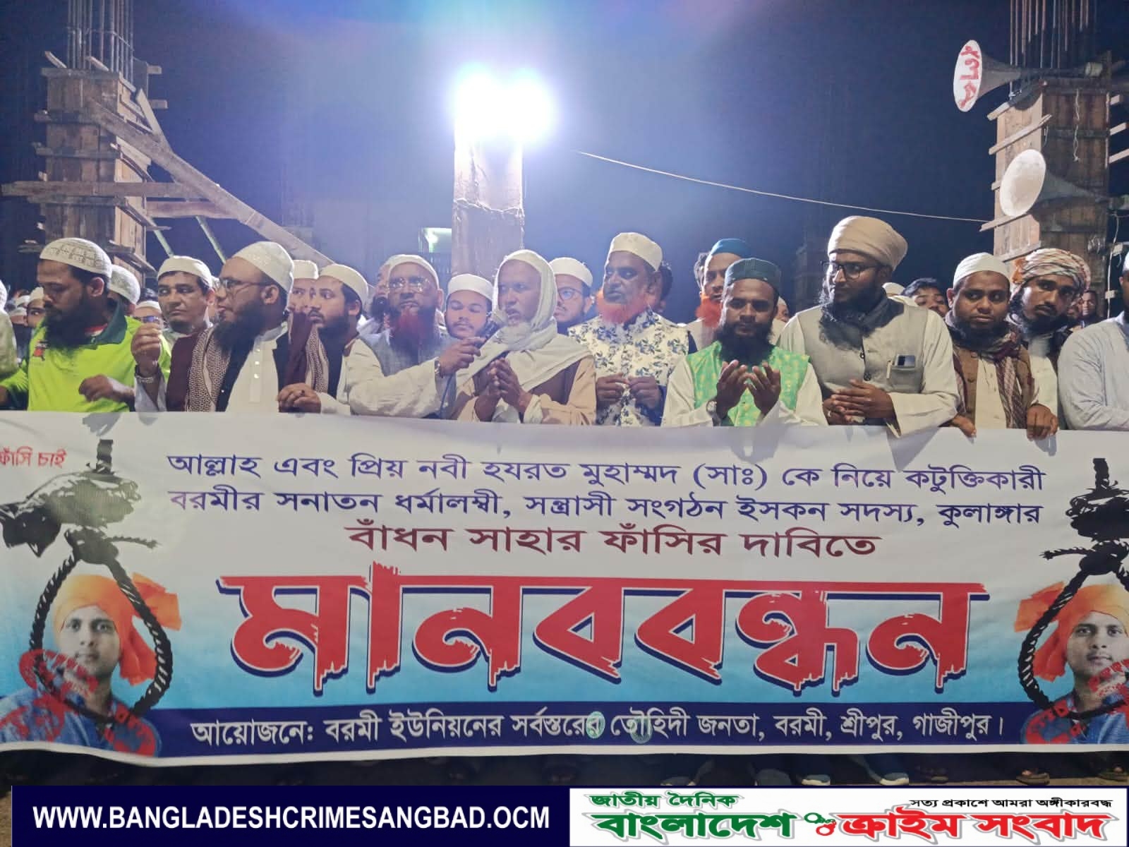 আল্লাহ এবং প্রিয় নবী হযরত মুহাম্মদ (সাঃ) কে নিয়ে কটুক্তিকারী বরমী সনাতন ধর্মালম্বী সন্ত্রাসী সংগঠন ইসকন সদস্য বাধন সাহার ফাঁসির দাবিতে, মানববন্ধন