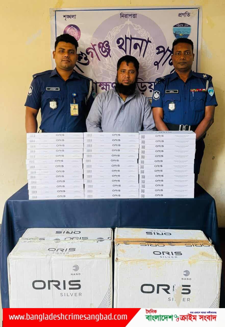 ব্রাহ্মণবাড়িয়ার আশুগঞ্জে বিপুল পরিমাণ চোরাচালানকৃত বিদেশি সিগারেটসহ এক ব্যক্তিকে গ্রেফতার করেছে পুলিশ। সোমবার (৩ নভেম্বর ২০২৫) সকাল সাড়ে ১১টার দিকে আশুগঞ্জ থানার একটি টিম গোপন সংবাদের ভিত্তিতে সোনারামপুর এলাকায় অভিযান চালিয়ে তাকে আটক করে। আশুগঞ্জ থানা পুলিশ জানায়, অভিযানে একটি সাদা রঙের NOAH মাইক্রোবাস আটক করা হয়। পরবর্তীতে মাইক্রোবাসে তল্লাশি চালিয়ে শুল্ক ফাঁকি দিয়ে আনা ৩,০০০ প্যাকেট (মোট ৬০,০০০ শলাকা) বিভিন্ন ব্র্যান্ডের বিদেশি সিগারেট উদ্ধার করা হয়। ঘটনাস্থল থেকে একজন চোরাকারবারীকেও গ্রেফতার করা হয়। গ্রেফতারকৃত ব্যক্তির নাম মোঃ আসাদুল্লাহ (৪৫)। তিনি ব্রাহ্মণবাড়িয়া জেলার সরাইল থানার নরসিংহপুর এলাকার বাসিন্দা। তাঁর পিতার নাম হাজী মমতাজ মিয়া এবং মাতার নাম রাবেয়া খাতুন। পুলিশ জানায়, উদ্ধারকৃত সিগারেট শুল্ক ফাঁকি দিয়ে অবৈধভাবে আনা হয়েছিল। উপস্থিত সাক্ষীদের সম্মুখে মালামালগুলো জব্দ তালিকা মূলে জব্দ করা হয়েছে। ঘটনার বিষয়ে আশুগঞ্জ থানায় নিয়মিত মামলা দায়ের করা হয়েছে।