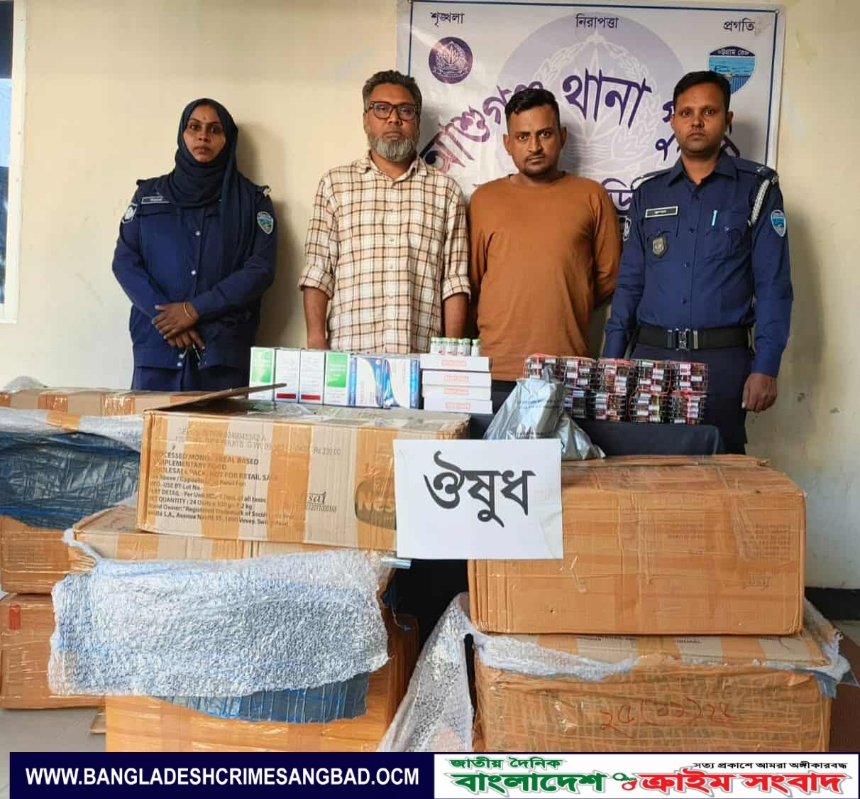 ১৫/১১/২০২৫ খ্রি. তারিখ সকাল ১০:৩০ ঘটিকায় আশুগঞ্জ থানা পুলিশের একটি টিম থানা এলাকায় গোপন সংবাদের ভিত্তিতে আশুগঞ্জ টোলপ্লাজা এলাকায় অভিযান পরিচালনা করে ০১টি প্রাইভেটকার আটক করে। প্রাইভেটকার তল্লাশীকালে ০২ জন চোরাকারবারীকে গ্রেফতার করে। এ সময় তাদের হেফাজত হতে শুল্ক ফাঁকি দিয়ে অবৈধ পন্থায় আনা ১। PILOMIN 0.5% =৭৪০০ পিস ,২। Sterile Noradrenaline Concentrate Ip- 4800 পিস, ৩। Steril Cardioplegia Solution = ১৯০ পিস, ৪। Human Normal Albumin Ip 5% বোতল-৫৫ টি, ৫। Terlipressin Ip Injection -১৮৫ পিস, ৬। THYROXINE SODIUM TABLETS I.P.50 mg ৬৫ বোতল, ৭। THROMBOPHIL GEL-৩৯০ পিস, ৮। Hyaluronidase Injection-৯৩০ পিস বিদেশী ঔষধ উদ্ধার করে। উদ্ধারকৃত মালামাল উপস্থিত সাক্ষীদের সম্মুখে বিধি মোতাবেক জব্দ তালিকা মূলে জব্দ করা হয়।