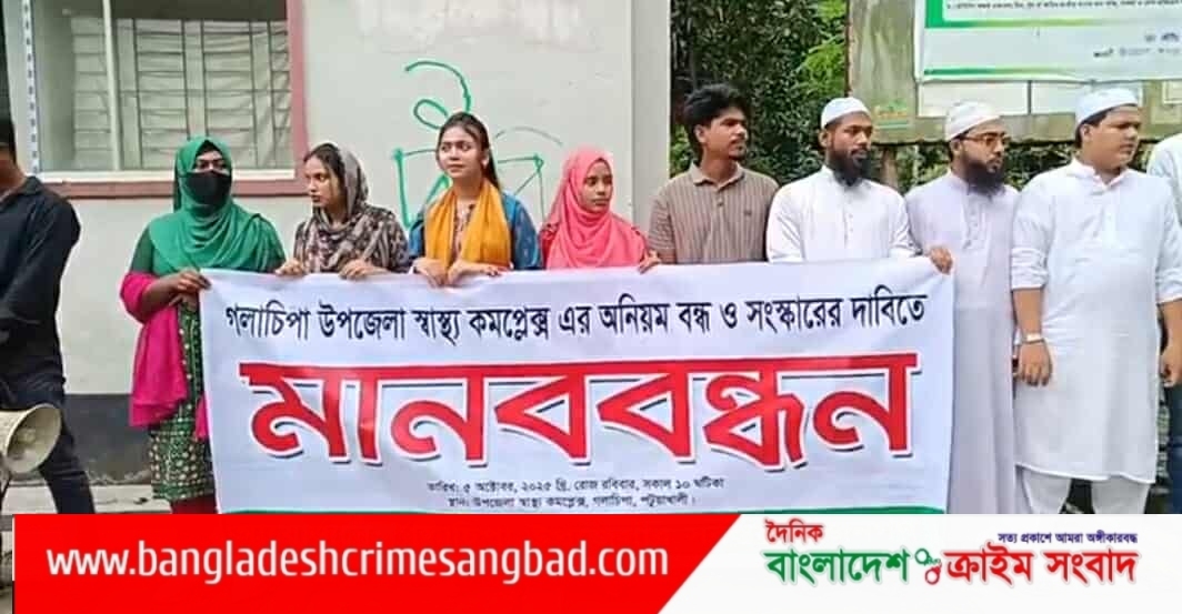 পটুয়াখালীর গলাচিপা উপজেলা স্বাস্থ্য কমপ্লেক্সে দীর্ঘদিন ধরে চলে আসা অনিয়ম, অব্যবস্থাপনা, চিকিৎসক সংকট ও জরাজীর্ণ ভবনের দ্রুত সংস্কারের দাবিতে মানববন্ধন অনুষ্ঠিত হয়েছে।
