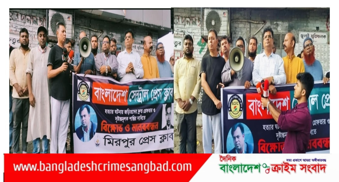 গাজীপুরে দৈনিক প্রতিদিনের কাগজ পত্রিকার সাহসী সাংবাদিক আসাদুজ্জামান তুহিন কে নির্মমভাবে হত্যা এবং দৈনিক বাংলাদেশের আলো পত্রিকার গাজীপুর প্রতিনিধি সাংবাদিক আনোয়ার হোসেন-এর ওপর মধ্যযুগীয় কায়দায় বর্বরোচিত হামলার প্রতিবাদে রাজধানীর মিরপুরে বিক্ষোভ ও মানববন্ধন কর্মসূচি পালন করেছে বাংলাদেশ সেন্ট্রাল প্রেস ক্লাব (B.C.P.C)।