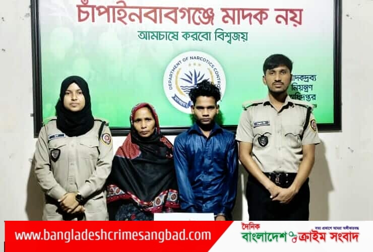 চাঁপাইনবাবগঞ্জে সদর মডেল থানাধীন দশরশিয়া গ্রামে( ১৩ অক্টোবর) সোমবার সকাল সাড়ে আট ঘটিকায় মৃত আমির হোসেনের বসতবাড়ী তল্লাশি করে ৯.৫ গ্রাম হেরোইনসহ মা ও ছেলেকে গ্রেফতার করে মাদকদ্রব্য নিয়ন্ত্রণ অধিদপ্তর (ডিএনসি)। ডিএনসির উপপরিচালক চৌধুরী ইমরুল হাসানের সার্বিক তত্ত্বাবধানে ও উপপরিদর্শক মোঃ মুস্তাফিজুর রহমান নেতৃত্বে এই অভিযান চালিয়ে ৯.৫ গ্রাম হেরোইন সহ ২ জন আসামি গ্রেফতার করে। আসামি হচ্ছে মৃত আমির হোসেনের স্ত্রী মোসাঃ চামেলী বেগম (৪৮), মৃত আমির হোসেনের ছেলে মোঃ সেলিম রেজা (২৫)। আসামি ২ জন সম্পর্কে মা ও ছেলে।