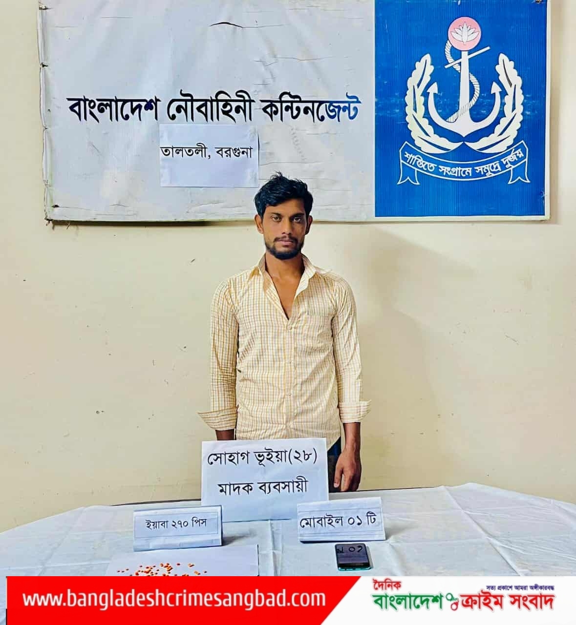 বরগুনার তালতলীতে ২৭০ পিস ইয়াবাসহ সোহাগ ভূঁইয়া (২৮) নামে এক মাদক ব্যবসায়ীকে আটক করেছে নৌবাহিনী।