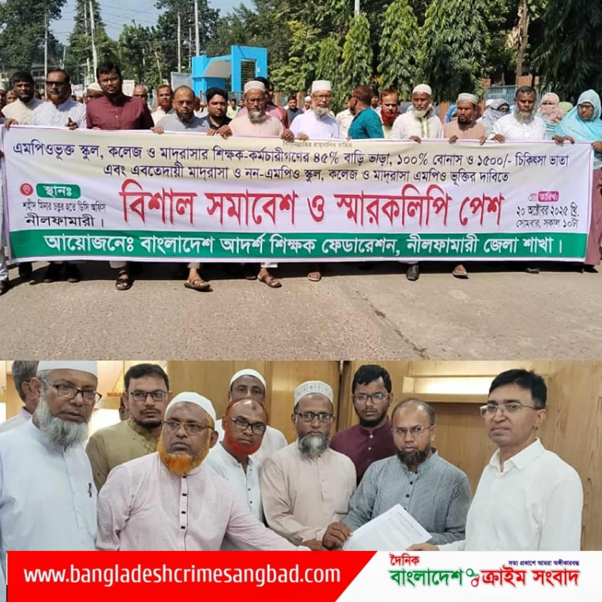 শিক্ষা সংস্কার, এমপিওভুক্তি, বকেয়া ভাতা পরিশোধ ও শিক্ষক-কর্মচারীদের জীবনমান উন্নয়নসহ পাঁচ দফা দাবিতে প্রধান উপদেষ্টার বরাবর জেলা প্রশাসক মোহাম্মদ নায়িদুজ্জামানের কাছে স্মারকলিপি প্রদান করেছে বাংলাদেশ আদর্শ শিক্ষক-কর্মচারী ফেডারেশন নীলফামারী জেলা শাখা।