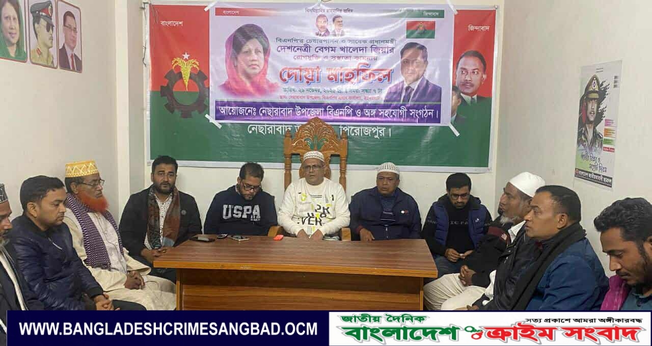 পিরোজপুরে, নেছারাবাদ (স্বরূপকাঠি) উপজেলায় বিএনপি চেয়ারপার্সন আপোষহীন নেত্রী বেগম খালেদা জিয়ার রোগমুক্তি ও সুস্থতা কামনায় দোয়া মাহফিলের আয়োজন করে নেছারাবাদ উপজেলা বিএনপি অঙ্গ ও সহযোগী সংগঠন। ২৯ নভেম্বর শনিবার মাগরিব বাদ ইন্দেরহাট অটোষ্ট্যান্ড সংলগ্ন বিএনপি কার্যালয়ে উক্ত দোয়া মাহফিল অনুষ্ঠিত হয়।
