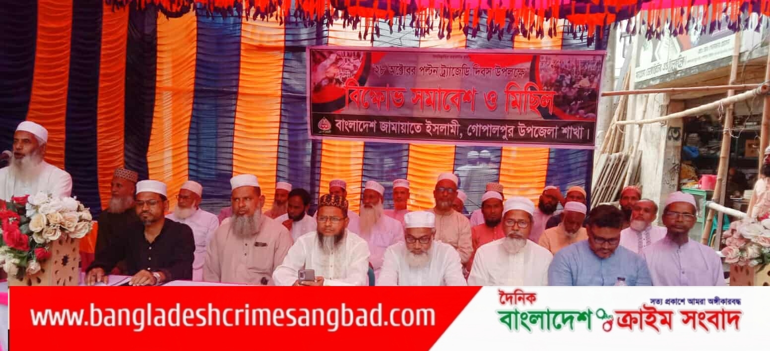 ২০০৬ সালের ২৮ অক্টোবর পল্টনে লগি বৈঠার তান্ডবের মাধ্যমে হত্যা ও হত্যার পরে লাশের উপর নৃত্যকারী খুনি সন্ত্রাসীদের বিচারের দাবিতে টাঙ্গাইল জেলার গোপালপুর উপজেলা জামায়াতে ইসলামির বিক্ষোভ মিছিল ও সমাবেশ অনুষ্ঠিত হয়েছে।