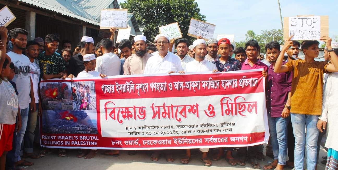 বিক্ষোভ সমাবেশ শেষে ফিলিস্তিনিনের নিরীহ মুসলমানদের জন্য দোয়া করা হয়।