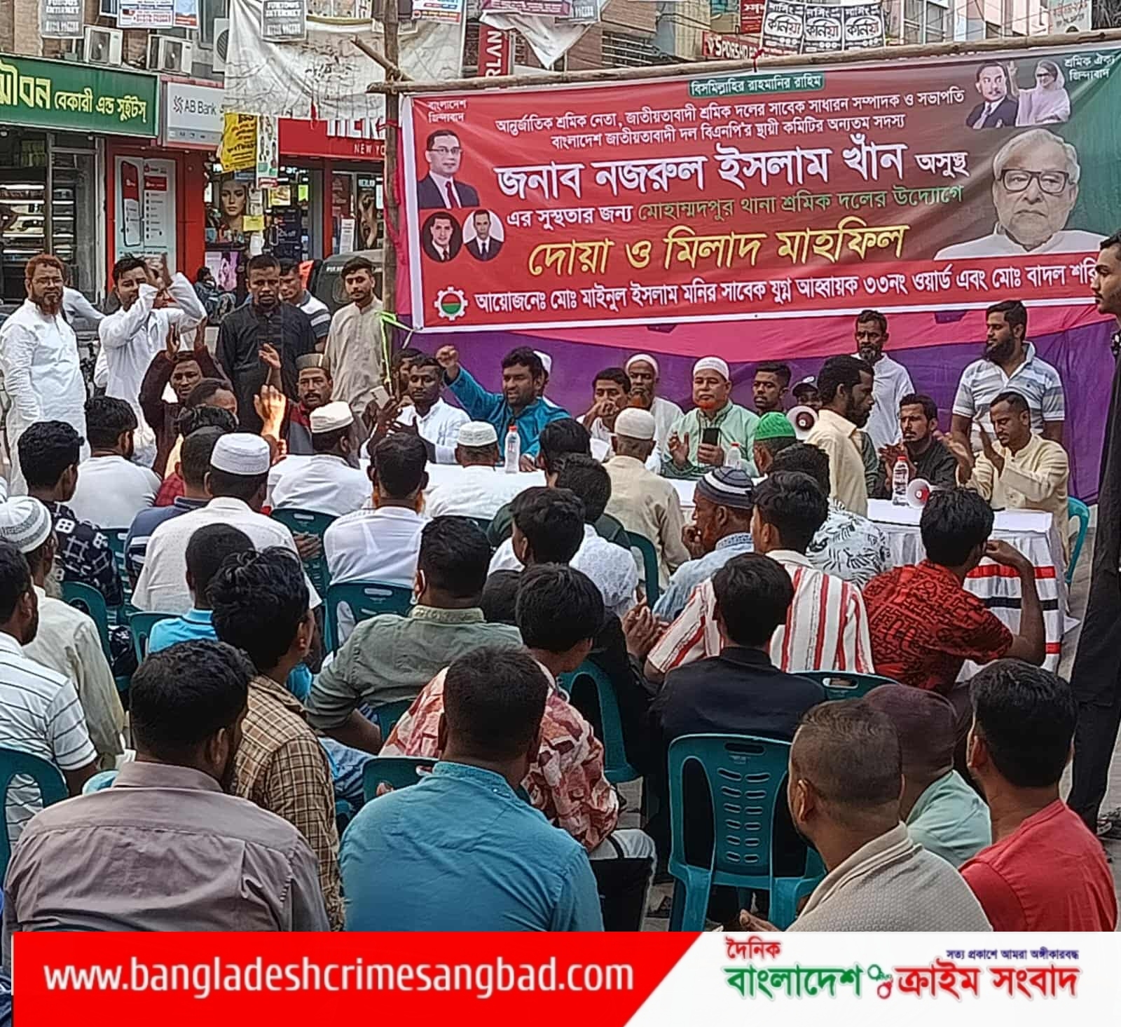 বাংলাদেশ জাতীয়তাবাদী দল (বিএনপি)-এর স্থায়ী কমিটির সদস্য, সাবেক রাষ্ট্রদূত ও আন্তর্জাতিক খ্যাতিসম্পন্ন শ্রমিক নেতা নজরুল ইসলাম খান এবং বাংলাদেশ জাতীয়তাবাদী শ্রমিক দলের সভাপতি আনোয়ার হোসেনের দ্রুত আরোগ্য কামনায় মোহাম্মদপুরে এক দোয়া মাহফিল অনুষ্ঠিত হয়েছে।