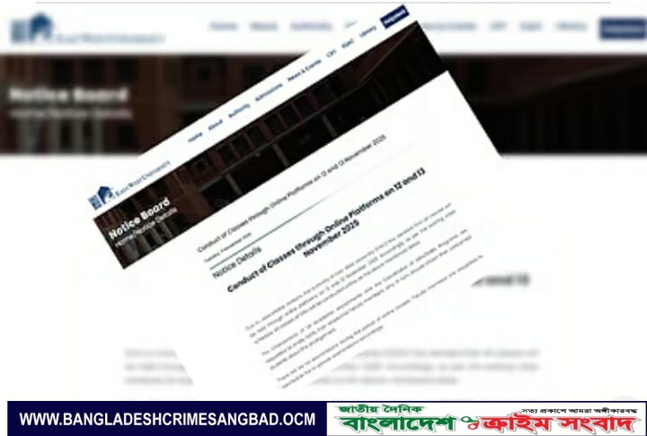 ইস্ট ওয়েস্ট ইউনিভার্সিটির ওয়েবসাইটে প্রকাশিত এক নোটিশে জানানো হয়েছে, ১২ ও ১৩ নভেম্বর বিশ্ববিদ্যালয়ের সব ক্লাস অনলাইনে অনুষ্ঠিত হবে।