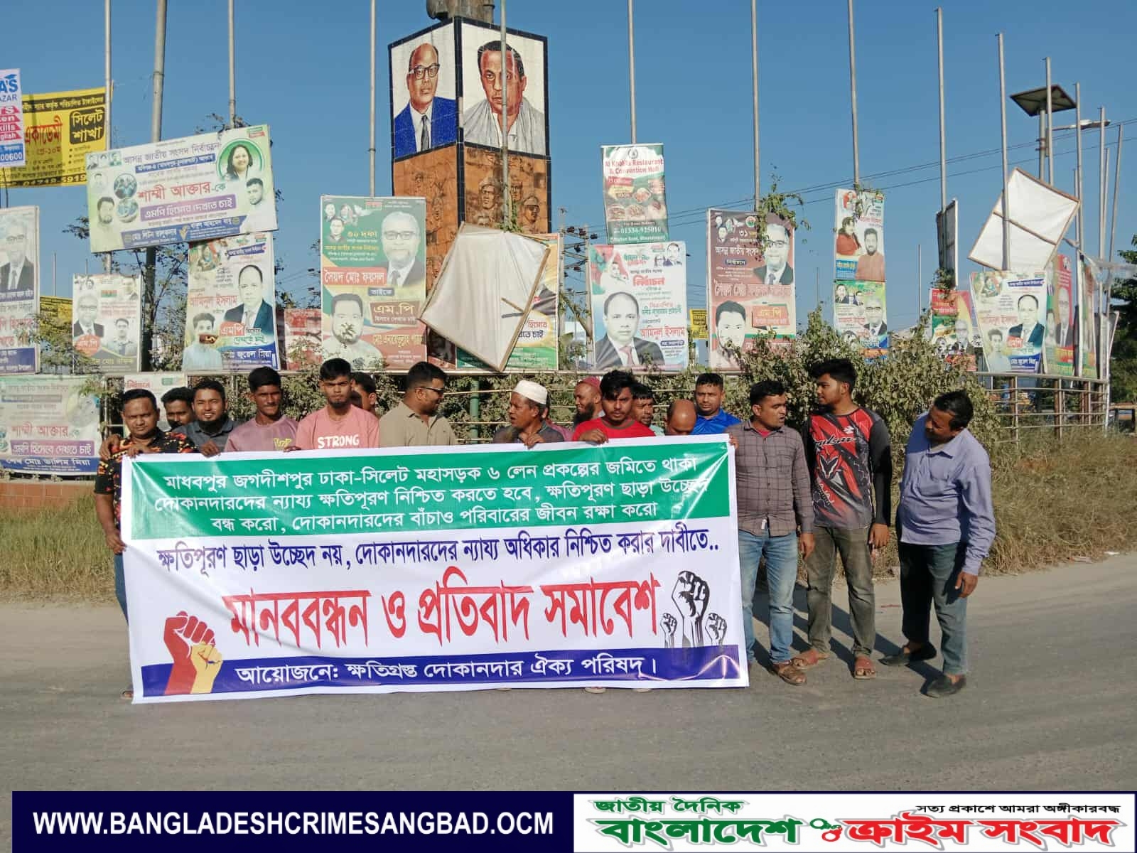 মাধবপুরে ৬ লেন প্রকল্পে উচ্ছেদ : ক্ষতিপূরণ না পেয়ে ক্ষতিগ্রস্ত দোকানদারদের মানববন্ধন