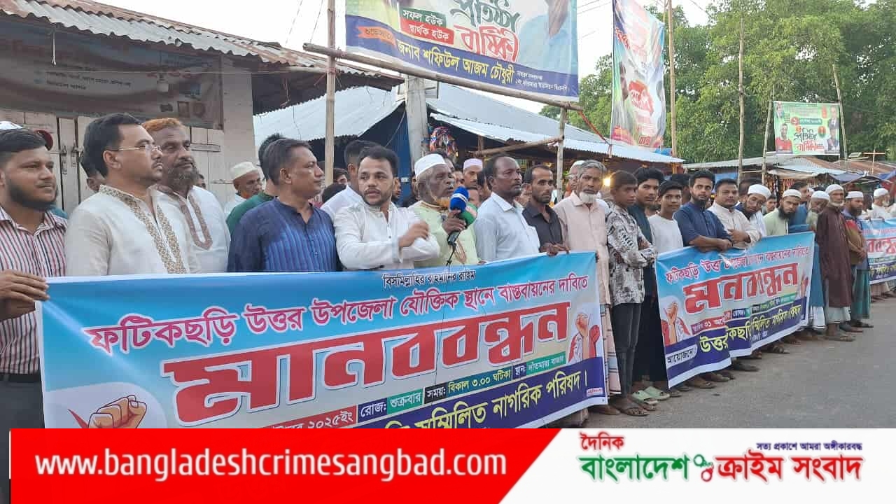 চট্টগ্রামের ফটিকছড়ি উপজেলাকে বিভক্ত করে ‘ফটিকছড়ি উত্তর’ নামে নতুন উপজেলা গঠনের প্রস্তাব অনুমোদনের পর সদর দপ্তর যৌক্তিক ও মধ্যবর্তী স্থানে স্থাপনের দাবিতে মানববন্ধন হয়েছে। এতে দক্ষিণাঞ্চলের প্রভাবশালী মহলের ষড়যন্ত্রের অভিযোগ তুলে কঠোর আন্দোলনের হুঁশিয়ারি দেওয়া হয়।