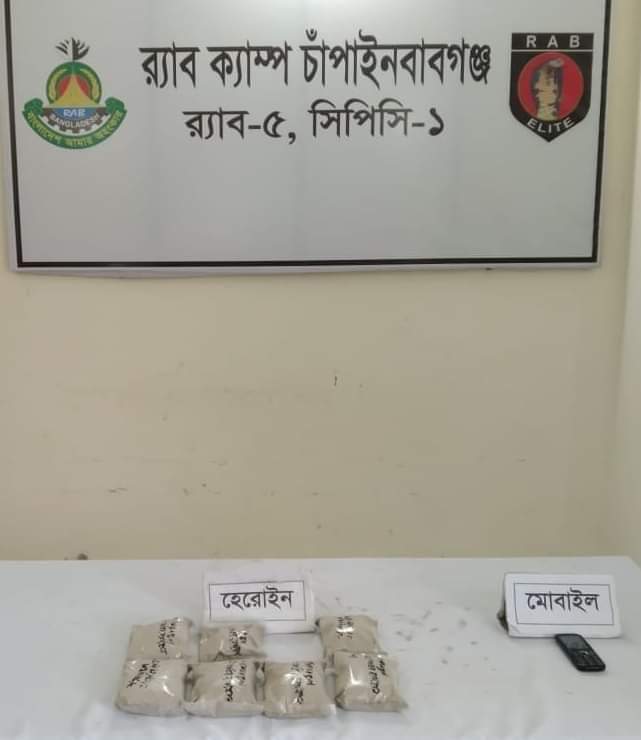 উক্ত অভিযানে, ১ কেজি ৯৭০ গ্রাম হেরোইন সহ শীর্ষ মাদক ব্যবসায়ী, মোঃ আবুল হায়াত (২৫), পিতাঃ মোঃ তাজামুল হক, মাতা- মোছাঃ কুলসুম বিবি, সাং-বিনোদনগর, ওয়ার্ড নং-০৯, ইউপি-দাইপুকুরিয়া, থানা- শিবগঞ্জ ও জেলা- চাঁপাইনবাবগঞ্জ’কে হাতেনাতে গ্রেফতার করা হয়। ধৃত মাদক ব্যবসায়ীর বিরুদ্ধে আইনানুগ ব্যবস্থা গ্রহন করা হচ্ছে।