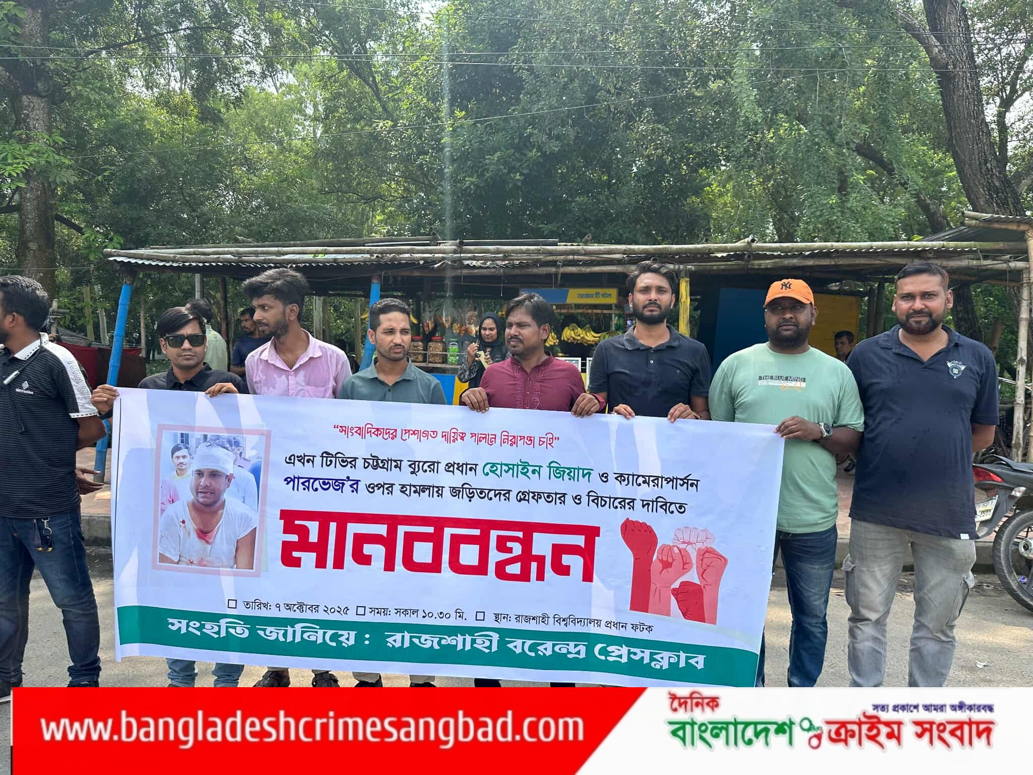 চট্টগ্রামের সীতাকুণ্ডের সলিমপুরে সংবাদ সংগ্রহ করতে গিয়ে এখন টেলিভিশনের চট্টগ্রাম ব্যুরো প্রধান হোসাইন জিয়াদ ও চিত্র সাংবাদিক পারভেজসহ তিন সাংবাদিকের ওপর হামলার ঘটনায় জড়িতদের দ্রুত গ্রেপ্তারের দাবিতে রাজশাহীতে মানববন্ধন অনুষ্ঠিত হয়েছে।
