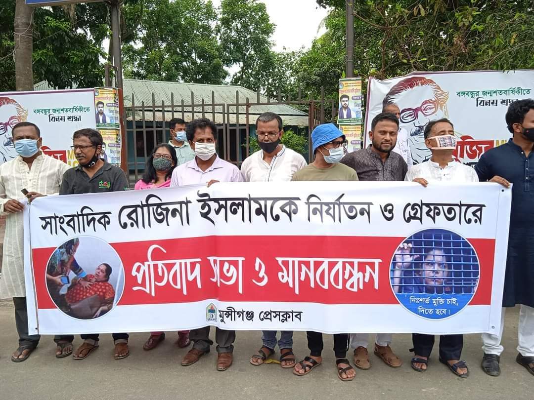 সাংবাদিক রোজিনা ইসলামের বিরুদ্ধে দায়ের করা মামলাকে মিথ্যা ও ষড়যন্ত্রমূলক মামলা প্রত্যাহার, অবিলম্বে তাঁকে নিঃশর্ত মুক্তি দেওয়া ও তাকে হেনস্থ্যাকারীদের বিরুদ্ধে আইনগত ব্যবস্থা গ্রহনের দাবি জানিয়েছেন মুন্সিগঞ্জের সাংবাদিক নেতারা।