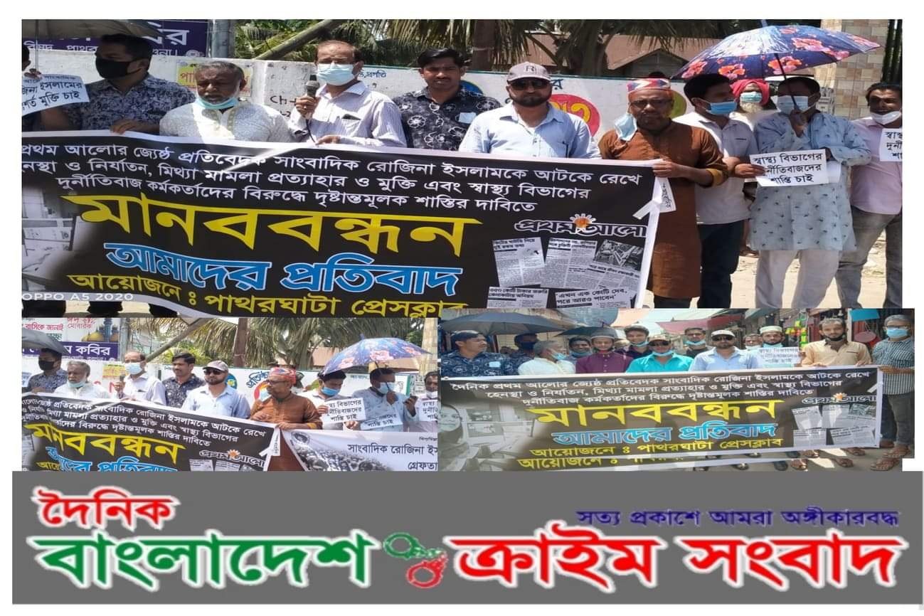সাংবাদিক রোজিনা ইসলামকে নির্যাতন ও মিথ্যা মামলা প্রত্যাহারের দাবিতে পাথরঘাটায় বিক্ষোভ মিছিল ও মানববন্ধন