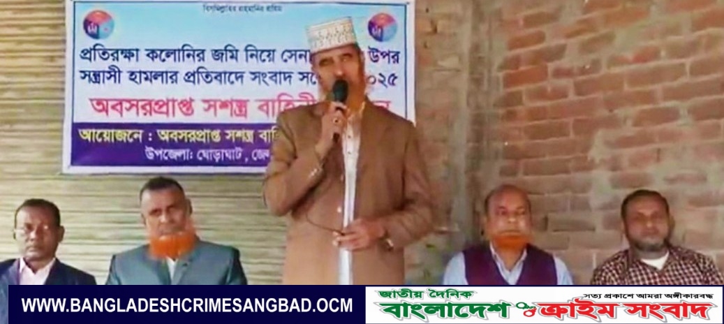 দিনাজপুরের ঘোড়াঘাটে প্রতিরক্ষা কলোনির জমি নিয়ে সেনাবাহিনীর উপর সন্ত্রাসী হামলার প্রতিবাদে সংবাদ সম্মেলন করেছে অবসরপ্রাপ্ত সশস্ত্রবাহিনী সংগঠন।