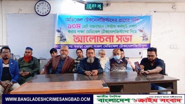 আরমান হোসেন ডলার (বিশেষ প্রতিনিধি), বগুড়া :- মেডিকেল টেকনোলজিস্টদের দীর্ঘদিনের প্রাণের দাবি ১০ম গ্রেড বাস্তবায়ন এবং আসন্ন কেন্দ্রীয় ঘোষিত কর্মসূচি সফল করার লক্ষ্যে বগুড়ায় আলোচনা সভা অনুষ্ঠিত হয়েছে। সোমবার (২৪